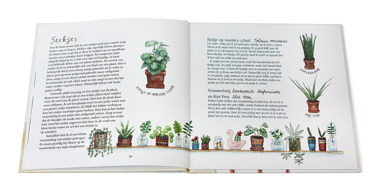 Een aansprekend verhaal waarmee ik graag aan de slag ging. Al schetsend vond ik de karakters van Sophie en de buurvrouw. Voor sommige planten had ik wel wat referentiemateriaal van internet nodig. Ons huis is groen en de tuin ook, maar lang niet alle planten die in het boekje voorkomen heb ik in m’n interieur.